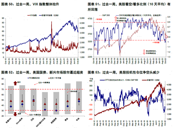 过去一周,美股看空/看多比例(10天平均)有所回落,美国国债、新兴市场股市逼近超卖。仓位方面,美股投机性仓位净空头减少,美元、黄金投机性净多头仓位增加。
