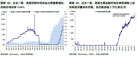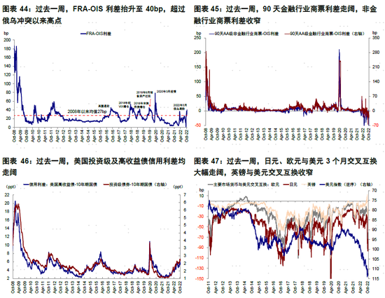 过去一周,FRA-OIS利差抬升至40bp,超过2008年以来均值水平和俄乌冲突以来新高,投资级及高收益债信用利差均走阔。90天金融行业商票利差走阔,非金融行业商票利差收窄,日元、欧元与美元3个月交叉互换大幅走阔,英镑与美元交叉互换收窄。美国主要金融机构逆回购使用量有所回落,但仍维持超2万亿美元/天。