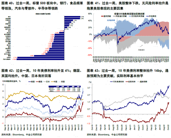 整体来看,过去一周美债利率仍抬升14bp至4%,美股收跌,成长落后,美元指数(113.0559, -0.2319, -0.20%)维持高位,油价和黄金回调。其他主要市场方面,日元本周贬值明显,但首相岸田文雄表示仍支持央行维持其宽松政策;英国此前的紧急购债计划于周五如期结束,并宣布恢复公司税至25% ,但市场对于这一逆转操作并不买账,英国国债利率周五抬升14bp,英镑(1.1227, 0.0049, 0.44%)兑美元贬值1.4%。