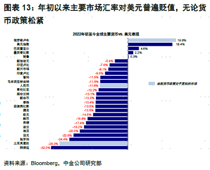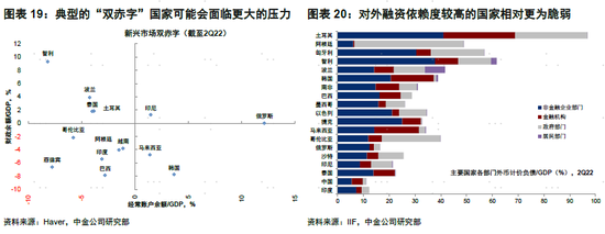 以不同市场比较为例:1)那些资产负债表有韧性(外储高)但现金流当前有压力(如出口型经济体)即便采取同样激进的对内紧缩政策,其汇率贬值依然明显;较高的外储不至于短期内造成较大危机,但是汇率和资金流出的压力难以避免,如韩国。2)那些资产负债表未必稳健(如外债较高且外储不足)但现金流充裕的市场,汇率依然够兑美元升值,如一些大宗商品出口国。3)但是,那些资产负债表和经常账户都有较大压力的市场(“双赤字”国家)则会面临更大压力。