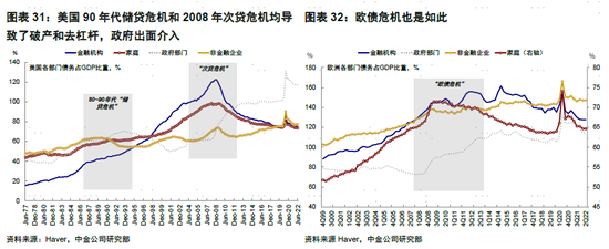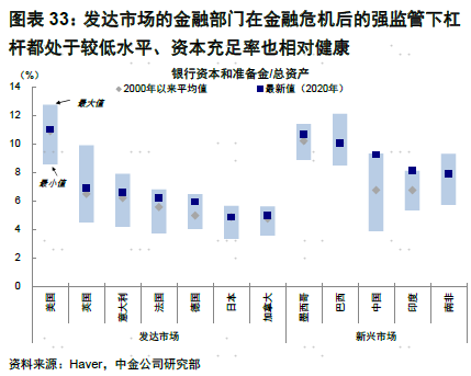 但如果资产恰好还有较严重的资产负债表压力(如债务或衍生品敞口),再由类似的偶发因素触发,那就会可能诱发债务和偿付危机。与流动性冲击不同,债务危机的影响更大,且不止限于金融体系,对实体经济的冲击也是较大的。此时,仅靠货币政策就无法解决所有问题,还需要政府介入进行债务重组,以消化高债务部门的压力,才能最终解决,上世纪80~90年代美国储贷危机和拉美债务危机、2008年次贷危机、2011年欧债危机等都是如此。目前来看,除了我们上述提到的灰犀牛外,发达市场金融部门在金融危机后的强监管下杠杆都处于较低水平、资本充足率也相对健康,这与此前危机情形还有很大区别。