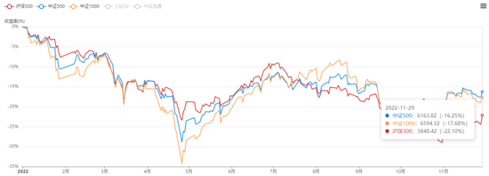 首先股市这边,截至11月29日,沪深300跌了22.1%,中证500和中证1000的跌幅也在17%左右。