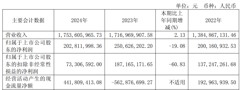 2024年,芯源微实现营业收入17.54亿元,同比增长2.13%;归属于上市公司股东的净利润2.03亿元,同比下降19.08%;归属于上市公司股东的扣非净利润7330.66万元,同比下降60.83%;经营活动产生的现金流量净额为4.42亿元,上年同期为-5.63亿元。